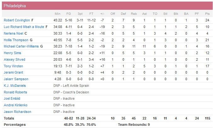 Michael Carter-Williams signe un triple-double sous les yeux de Will Smith assis au premier rang avec 16 points, 11 passes et 11 rebonds et les 76ers prendront jusqu’à 18 points d’avance. Déficit que les Grizzlies rattraperont durant les 7 dernières minutes (merci aux ballons perdus et à la sélection de shoots douteuse de Philadelphie, seule équipe à n’avoir pas encore gagné à domicile cette saison) du quatrième quart-temps avant d’exulter sur le shoot de Conley (14 points dans le quatrième). Zach Randolph était en mode «beast» avec 24 points à 10/14 et 11 rebonds alors que Marc Gasol signe 18 points à 6/11 et 9 rebonds.