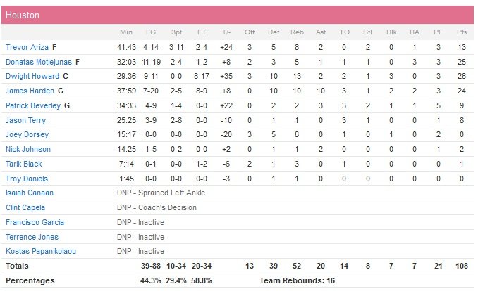 Presque au complet, les Rockets ont retrouvé leur force de frappe et se sont imposés 108-96 face aux Nuggets cette nuit. Dwight Howard termine à 26 points (9/11) 3 contres et 13 rebonds (il a atteint les 10 000 en carrière) pour son premier match en 11 rencontres (genou) alors que James Harden se paye un triple-double avec 24 points à 7/20, 10 rebonds et 10 passes. N’oublions pas non plus Donatas Motiejunas, qui bat son record en carrière avec 25 points (23 à la mi-temps) à 11/19 et 5 rebonds.