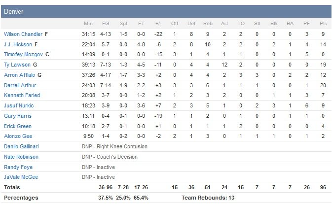 En face Ty Lawson enregistre un match très correct avec 19 points et 12 passes et Darrell Arthur termine meilleur marqueur pour Denver avec 20 points. Houston prendra même 14 points de retard en première mi-temps après avoir encaissé un 13-3 (32-21 Denver) avant de prendre l’avantage en deuxième quart-temps et de ne plus jamais le lâcher. C’est grâce à un 21-4 (les 7 premiers points pour Motiejunas) que les hommes de Kevin McHale se remettent dans le match, prenant le contrôle à 47-44 avec 2 minutes et demi à jouer dans le deuxième quart. Howard se fait lui remarquer durant ce run par un contre sur Timofey Mozgov qui se transforme en dunk à deux mains sur alley oop. À la pause, les Rockets sont devant 54-48.