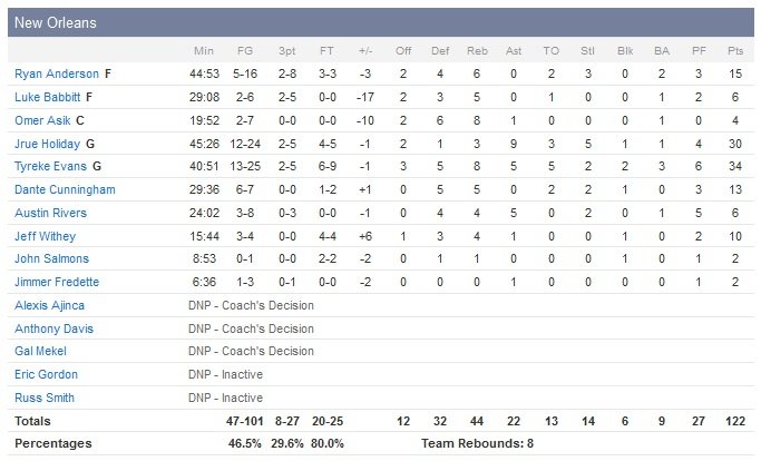 L’homme du match se nomme Tyreke Evans pour les Pelicans avec 34 points. Il est néanmoins contraint de sortir pour 6 fautes à 3 minutes de la fin de la prolongation. En l’absence d’Anthony Davis (contusion à la poitrine), Jrue Holiday prend ses responsabilités avec 30 points, 9 passes et 5 interceptions et New Orleans menait encore 107-99 à 4″16 de la fin du quatrième quart-temps. Tout le monde a participé à l’effort côté Warriors pour remonter au score, à l’image des 20 points d’Andre Iguodala, des 12 unités de Shaun Livingston ou des 12 points de Marreese Speights, qui inscrit un lancer-franc égalisateur à 111-111 en fin de temps réglementaire.