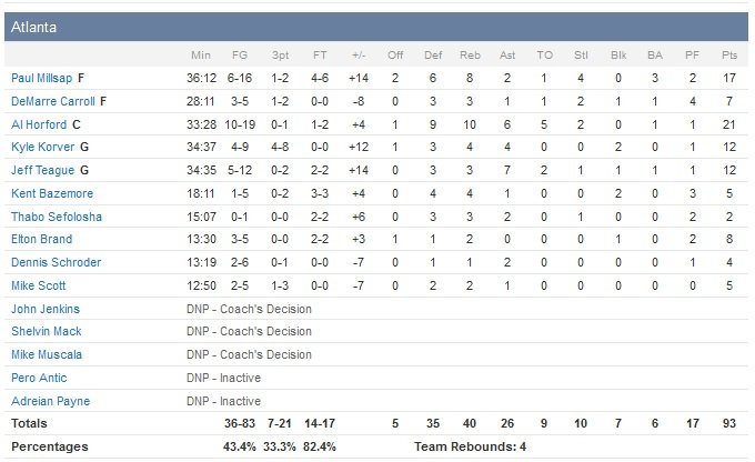 Atlanta a fait la course en tête tout le match sans pour autant réussir à dépasser les 10 points d’avance. Jimmy Butler mène les Bulls avec 22 points (8/17, 9 rebonds) alors que Derrick Rose a été bien gêné et termine à 14 points à 6/21 dont un joli 0/7 à 3-points et y ajoute 8 passes, 5 rebonds et 6 ballons perdus. Chicago (37.6% aux tirs contre 43.4% pour les Hawks) n’avait plus perdu contre Atlanta depuis 6 rencontres. Taj Gibson limite la casse avec un énorme double-double : 15 points à 7/11 et 17 rebonds, épaulé par les 13 points à 6/15 et 12 rebonds de Pau Gasol, qui a dû faire avec les 17 points de Paul Millsap (6/16, 8 rebonds, 4 steals) en face.