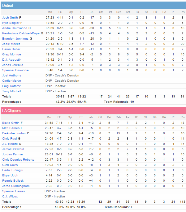 Les Clippers se sont appuyés sur leur collectif avec une marque très équilibrée. 8 joueurs marquent entre 8 et 18 points avec 18 points, 7 rebonds et 7 passes pour Blake Griffin tandis que DeAndre Jordan compile 16 points et 15 rebonds dont 8 offensif. Petit match encore une fois de Chris Paul avec 11 points et 8 passes. La défense des Pistons n’a pas réussi à freiner les Californiens qui ont shooté à 53.8% dont un excellent 12/24 à trois points. Bien trop maladroits comme à leur habitude (42.2%, 8/27 à trois points et 13/22 aux lancers), les Pistons n’ont pas tenu bien longtemps.