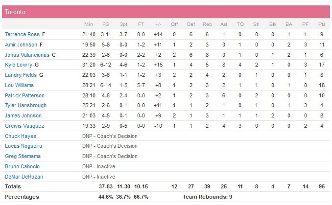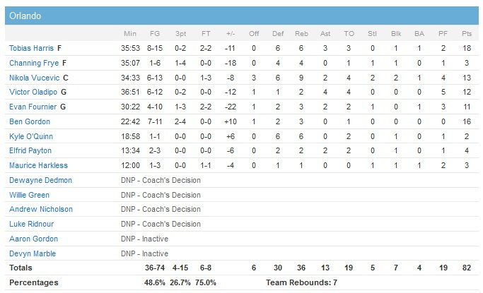 En face Tobias Harris termine meilleur marqueur avec 18 points (8/15, 6 rebonds), Ben Gordon 16 (7/11), Nikola Vucevic 13 (6/13, 9 rebonds 2 contres) et Victor Oladipo 12 (6/12, 4 passes) pour un Magic qui n’a plus gagné à Toronto depuis le 26 mars 2012. Evan Fournier a lui connu quelques difficultés au tir avec 11 points à 4/10, 3 rebonds et 2 passes). Toronto mène 24-14 après un shoot de Lowry à 3″38 de la fin du premier quart-temps mais le magic recolle à 28-25 après 12 minutes. Harris égalise à 42 partout sur deux lancers-francs à 5″01 dans le deuxième puis enchaîne 8 points consécutifs qui permettent à Orlando de virer en tête, 44-42. Les Raptors ne rentrent pas un shoot avant un hook shot de Tyler Hansbrough à 6″52 et Orlando est devant 52-44 à la pause.