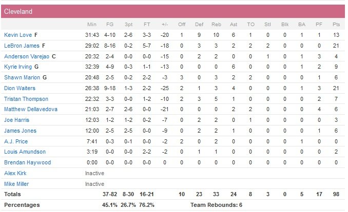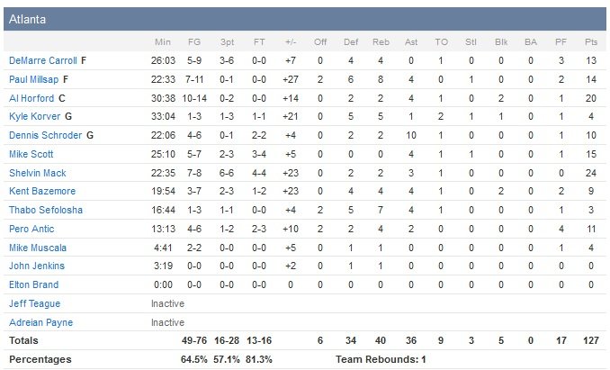 Le match n’avait rien à voir avec la première rencontre entre les deux équipes le 15 novembre dernier (Cleveland était inarrêtable au tir avec un 11/11 à 3-points et l’avait emporté facilement). Shelvin Mack (3.8 points de moyenne avant le match) sort un 6/6 à 3-points en guise de vengeance et bat son record de points en carrière avec 24 unités. Atlanta remporte ainsi une 11e victoire en 12 matchs et aura shooté à 16/28 derrière la ligne durant la rencontre. En retard de 12 points 50-38 en milieu de deuxième quart-temps, les Hawks vont passer un 89-49 aux Cavaliers (qui n’avaient jamais perdu d’autant de points, 29, jusque-là cette saison) le restant de la rencontre. Le tout sans leur leader offensif Jeff Teague (ischio). LeBron James (8/16, 3 rebonds 2 passes) ne marque que 21 points (tout comme Dion Waiters) mais David Blatt ne l’a pas fait entrer du quatrième quart-temps. En face Al Horford fait mal à la raquette des Cavs avec 20 points à 10/14 tandis que Mike Scott ajoute 15 points.