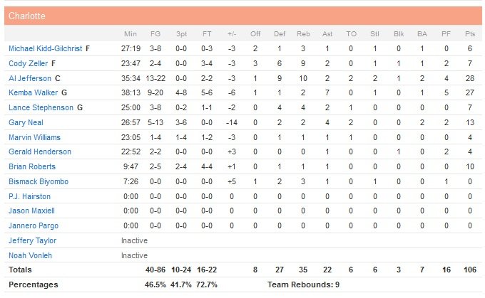 Gerald Green ajoute 16 points, Eric Bledsoe 15 et la défense de P.J. Tucker bat toutes les lignes de stats dans les ultimes secondes alors que Kemba Walker (27 points à 9/20, 7 passes) avait le ballon pour égaliser. Al Jefferson signe 28 points (13/22) et 10 rebonds mais n’empêche pas la 4e défaite consécutive de son équipe, qui n’a pas su maintenir son avance acquise en première mi-temps. Charlotte (6V-19D) ne compte toujours qu’une victoire en 12 matchs face aux équipes de la Conférence Ouest. Pour éviter de se prendre un 21-0 (remember Cleveland) en début de match, les Hornets se reposent sur Jefferson à l’intérieur et ça marche avec 18 points d pivot à 8/10 dans les premières 12 minutes. Jefferson ne marque pas dans le deuxième, marqué par un Tucker très physique malgré son déficit de taille. Résultat les Suns reviennent après avoir été menés de 17 points, 61-54 à la pause. Markieff Morris est éjecté dans le troisième quart-temps pour avoir un peu trop contesté les décisions arbitrales et termine à 13 points. Phoenix retrouve finalement l’avantage à 105-104 et 1″31 à jouer suite à une interception de Dragic sur Gary Neal.