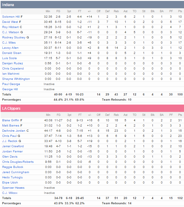 Après une première mi-temps très disputée (30-27 puis 52-51 pour les Clippers) les Clippers ont fait un mini-break en troisième quart (78-72) grâce à un gros quart de son trio mené par les 11 points de Blake Griffin. Les Pacers ont débuté le dernier quart par un 13-3 pour faire passer un déficit de 6 points en une avance de 85-81 avec moins de 9 minutes à jouer. Le souci c’est qu’ils n’ont mis que 3 paniers dans les dernières 5’38 du match et cela a fini par leur coûté le match. CJ Miles a donné 6 points d’avance aux siens sur un dunk avant que les Clippers ne répliquent par un 14-4 pour se positionner idéalement 97-93 avec 2’35 au chronomètre. Indiana s’est accroché avec un panier de Rodney Stuckey puis 3 lancers de CJ Watson qui ont réduit le score à 98-99 à 35 secondes du terme. Griffin a perdu le ballon sur l’action suivante mais Stuckey n’a pu donner l’avantage aux siens derrière, pousant les Pacers à faire faute et à envoyer JJ Redick sur la ligne. Il a mis les deux et derrière Watson a marqué avec 3.4 secondes à jouer. Avec un seul lancer marqué sur deuxpar Redick les Pacers ont eu une dernière chance mais le trois points au buzzer de CJ Miles a rebondi sur l’arceau.