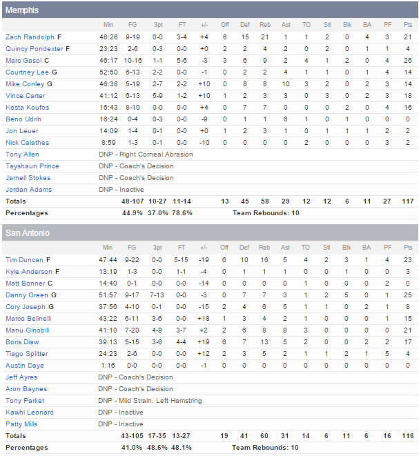 Marc Gasol est un des héros du match avec 26 points dont un tir à trois points avec la planche qui a permis aux siens d’aller en prolongation au buzzer de la fin du temps réglementaire. Il a été aidé par les 21 points et 21 rebonds de Zach Randolph alors que Vince Carter en ajoute 18. De l’autre côté Danny Green inscrit 25 points et Tim Duncan compile 23 points et 16 rebonds dont le shoot au buzzer qui a envoyé le match en triple-prolongation. Toutefois son 5/15 aux lancers francs a fait mal aux Spurs. Manu Ginobili ajoute lui 21 points mais il a raté de la panier à trois points de la victoire en troisième prolongation.
