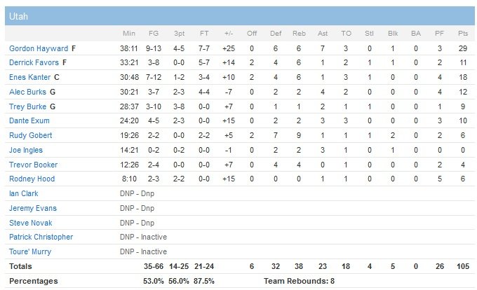 Les 29 points (9/13, 7 passes et 6 rebonds) de Gordon Hayward et 18 points à 7/12 et 6 rebonds d’Enes Kanter ont permis au Jazz de survivre aux 42 points (12/19, 16/21 aux lancers-francs, 4 rebonds 3 passes mais aussi 6 ballons perdus) de Dwyane Wade, son plus gros match depuis 45 points inscrits en 2010. Utah s’impose 105-87.