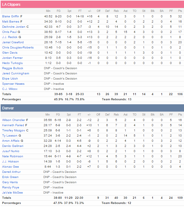 Nate Robinson a permis aux Nuggets de mettre fin à une série de 3 défaites grâce à 20 points en sortant du banc pour mener 7 Nuggets à au moins 10 points. Kenneth Faried signe 14 points à 6/9 et Timofey Mozgov 13 à 6/8. En face Blake Griffin signe son second match de suite à au moins 30 points avec 32 unités à 9/20 et 12 rebonds tandis que Chris Paul ajoute 17 points et 15 passes et Jamal Crawford 20 points.