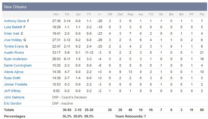 Aldridge prend le contrôle du match dès le début de la rencontre après une interception sur Tyreke Evans (6 points à 2/11). Il enchaîne avec un shoot à 4/5m et un lancer-franc de l’autre côté. Sur la possession suivante, l’intérieur s’éloigne un peu plus du cercle pour rentrer un tir à 6m puis Wesley Matthews (9 points à 3/8) enchaîne à 3-points. Après quatre minutes de jeu, Aldridge compte déjà 9 points et Portland compte 10 points d’avance. À 62-44 en faveur de Portland à la mi-temps Monty Williams comprend vite qu’il ne sera pas utile de laisser très longtemps ses titulaires sur le terrain et fait tourner. Austin Rivers termine meilleur marqueur des Pelicans avec 21 points et Ryan Anderson suit avec 16 points. En face Damian Lillard signe 17 points et 7 passes, Chris Kaman 16 points et 5 rebonds et Nicolas Batum, préservé face aux Spurs dans le match précédent, 11 points et 5 passes