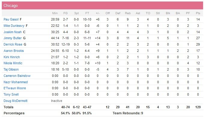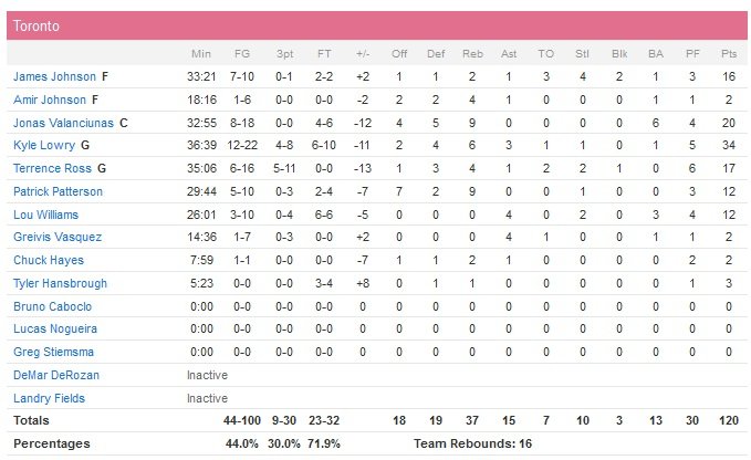 C’est dans un quatrième quart-temps historique que les Bulls ont fait la différence avec tout simplement 49 points marqués ! Dont 15 pour Rose, qui a été clutch. Toronto, porté par Kyle Lowry (34 points à 12/22, 6 rebonds et 3 passes) prend les commandes de la première mi-temps, remportée 66-60. L’écart passera à 12 points en faveur des Raptors dans le troisième quart alors que Jonas Valanciunas épaule bien son meneur (qui marquera plus tard 18 points dans le quatrième quart-temps !) avec 20 points à 8/18 et 9 rebonds.