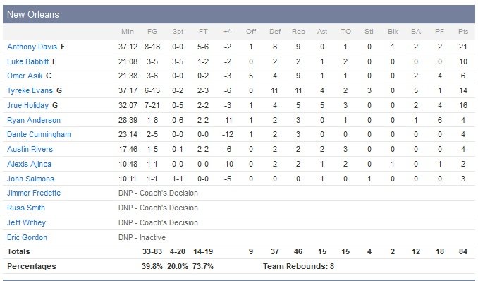 Avec lui, les Pacers (10V-19D) ont retrouvé une certaine cohésion jusque-là absente cette saison. Indiana (50% de réussite contre 39.8% pour ses adversaires) a développé une attaque plus maîtrisée et comptent 6 joueurs à au moins 10 points. En face Anthony Davis termine à 21 points à 8/18 et 9 rebonds, Tyreke Evans à 14 points et Jrue Holiday à 16 points à 7/21 et 5 passes. Toujours prêts à faire l’extra pass ou à trouver un meilleur shoot, les joueurs de Frank Vogel sont plus patients et en fin de rencontre, Indiana compte 24 passes décisives (contre seulement 15 pour New Orleans). David West et Solomon Hill signent tous les deux 13 points alors que Roy Hibbert réalise son meilleur match défensif de la saison avec 14 points à 5/10 mais surtout 7 contres. C.J. Miles ajoute 11 points et 6 rebonds. Les Pelicans ne sont jamais complètement lâchés mais ne parviendront pas à remonter le court écart qui aura séparer les deux équipes durant toute la rencontre.