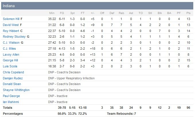 Avec lui, les Pacers (10V-19D) ont retrouvé une certaine cohésion jusque-là absente cette saison. Indiana (50% de réussite contre 39.8% pour ses adversaires) a développé une attaque plus maîtrisée et comptent 6 joueurs à au moins 10 points. En face Anthony Davis termine à 21 points à 8/18 et 9 rebonds, Tyreke Evans à 14 points et Jrue Holiday à 16 points à 7/21 et 5 passes. Toujours prêts à faire l’extra pass ou à trouver un meilleur shoot, les joueurs de Frank Vogel sont plus patients et en fin de rencontre, Indiana compte 24 passes décisives (contre seulement 15 pour New Orleans). David West et Solomon Hill signent tous les deux 13 points alors que Roy Hibbert réalise son meilleur match défensif de la saison avec 14 points à 5/10 mais surtout 7 contres. C.J. Miles ajoute 11 points et 6 rebonds. Les Pelicans ne sont jamais complètement lâchés mais ne parviendront pas à remonter le court écart qui aura séparer les deux équipes durant toute la rencontre.