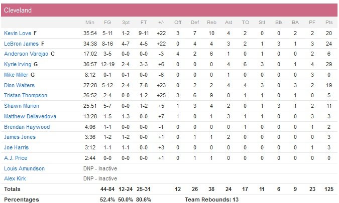 Pour son premier match contre son ancienne équipe, Kevin Love a signé 20 points (5/11, 10 rebonds, 4 passes), accompagné par un Kyrie Irving qui a enfin retrouvé son shoot avec 29 points à 12/19, 4 passes et 3 interceptions. LeBron James ajoute 24 points (8/16, 4 rebonds, 3 passes, 3 contres) et Cleveland remporte son 12e match en 15 rencontres (après un début de saison à 5V-7D) face aux Wolves d’Andrew Wiggins (27 points à 9/16) et Gorgui Dieng (20 points à 6/10 et 11 rebonds), 125-104.