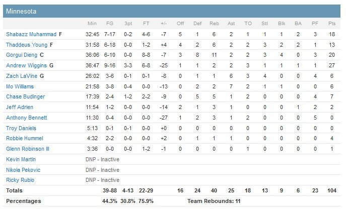 Seule ombre au tableau la blessure d’Anderson Varejao survenue dans le troisième quart-temps. Le pivot brésilien a quitté le match sans pouvoir s’appuyer sur sa jambe gauche. Minnesota perd ainsi son 12e match en 13 rencontres et une 6e rencontre d’affilée. Les Wolves parviennent à faire jeu égal avec Cleveland (52.4% contre 44.3% de réussite pour Minnesota et 50% à 3-points contre 30.8%) durant un quart-temps mais sont menés 64-56 à la pause. Les joueurs de David Blatt vont définitivement fait tourner le match à leur avantage dans le troisième quart-temps. Menant déjà de 12 points 82-70, ils vont passer un 16-1 à l’équipe de Flip Saunders