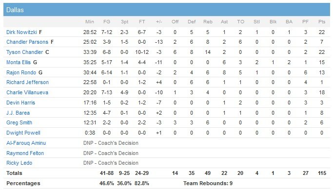 Dirk Nowitzki (7/12, 5 rebonds) et Tyson Chandler (6/8, 14 rebonds) mènent les Mavericks avec 22 points chacun alors que Rajon Rondo fait du Rajon Rondo avec 13 points (6/14), 8 passes, 6 rebonds mais aussi 5 balles perdus avant de sortir pour 6 fautes à 1″37 de la fin du match. Dallas perd un deuxième match consécutif pour la deuxième fois de la saison seulement et concède 28 points sur 20 ballons perdus à Phoenix (dont 10 turnovers dans le seul deuxième quart-temps, période où les Suns ont définitivement pris le contrôle du match). Les Suns shootent à 9/14 à 3-points en seconde mi-temps après avoir totalité un 4/19 lors des deux premiers quarts.
