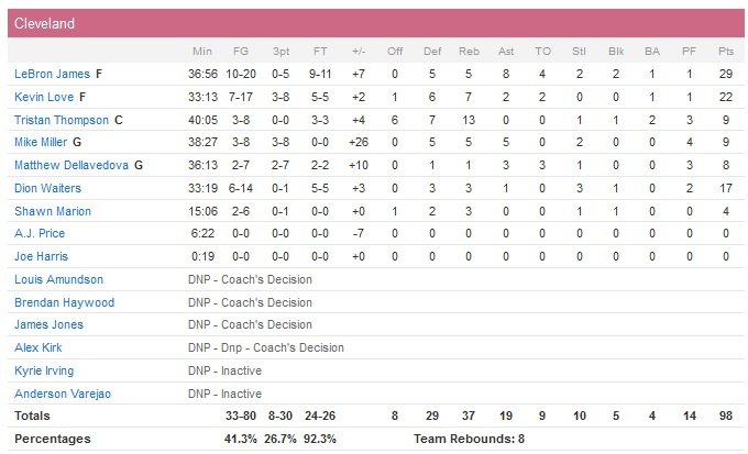 Avec 29 points à 10/20 (0/5 à 3-points et 9/11 aux lancers-francs), 5 rebonds, 8 passes, 2 interceptions et 2 contres, LeBron James a dû noircir la feuille de stats pour venir à bout du Magic cette nuit, 98-89. Sans Kyrie Irving (contusion genou) et Anderson Varejao (rupture du tendon d’Achille), Cleveland a souffert et a dû s’employer pour venir à bout d’Orlando, mené par 16 points (7/16, 4 rebonds, 4 passes) de Tobias Harris et 15 points (5/10, 4 rebonds, 2 passes, 2 interceptions) d’Evan Fournier en sortie de banc.