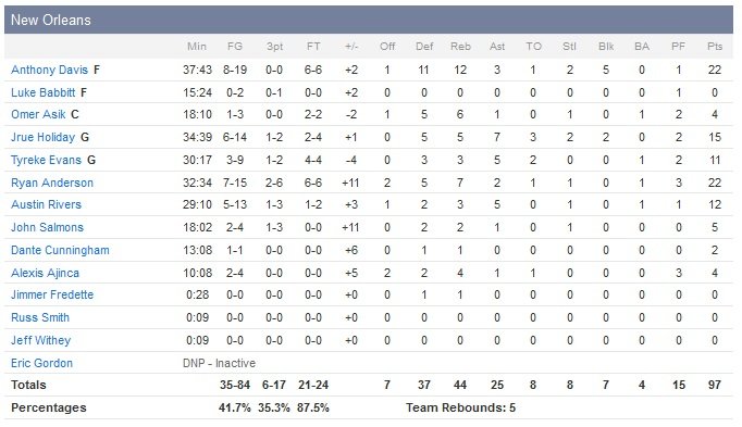 Davis prend quelques minutes de repos en début de quatrième quart et les remplaçants font le boulot, 81-72 sur un shoot d’Anderson à 7″50. John Salmons ajoute un 3-points qui donne 12 points d’avance à 5 minutes et demi du buzzer final et les Pelicans s’imposent pour la deuxième fois cette saison malgré un pourcentage de réussite plus faible que celui de son adversaire (41.7% contre 49% pour les Spurs). Cela avait déjà été le cas contre Utah le 22 novembre.