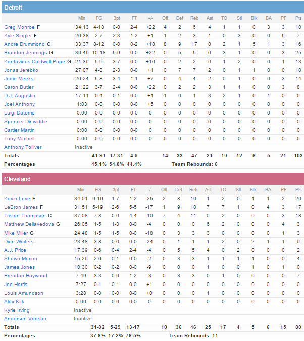 Après un bon début de match où ils ont pris tranquillement 15 points d’avance, les Cavaliers ont totalement explosé face à des Pistons sur un nuage dans le sillage de Brandon Jennings (25 points à 10/18 dont 5/9 à trois points en 31 minutes). Entre le second quart et le dernier quart les hommes de Stan Van Gundy ont passé un 73-31 à la faveur d’une excellente adresse extérieure (17/31, record de franchise de tirs à trois points inscrits) . Caron Butler, Jonas Jerebko et Jodie Meeks ont eux participé à des séries clés avec 8, 10 et 14 points au total. Andre Drummond a été lui ultra présent sous le cercle avec 16 points, 17 rebonds et 5 contres alors que Greg Monroe a lui raté tout ce qu’il a tenté avec 10 points à 4/18 et 6 rebonds. Kentavious Caldwell-Pope signe lui 13 points à 5/9.