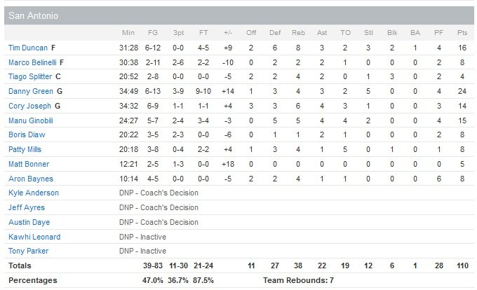 Sans Tony Parker (ischio-jambiers) et Kawhi Leonard (déchirure ligament de la main), les Spurs se sont reposés sur Tim Duncan (16 points à 6/12, 8 rebonds, 3 passes, 3 interceptions et 2 contres) en début et fin de match. Manu Ginobili apporte lui 15 points (5/7, 5 rebonds, 4 passes). En face James Harden termine à 28 points (10/18, 5 passes, 9 ballons perdus) et Dwight Howard à 24 points (11/13) et 17 rebonds alors que Corey Brewer (25 points à 8/11) connaît plus de succès que Josh Smith (5 points à 2/7, 8 rebonds, 2 interceptions) pour les nouvelles recrues. La bataille fût longue et épuisante pour les deux équipes, qui verront l’avantage changer 20 fois de camp et 13 égalisations durant la rencontre. San Antonio (47%) marque 28 points dans chacun de deux premiers quarts-temps et ne mène que d’un point à la pause, 56-55.