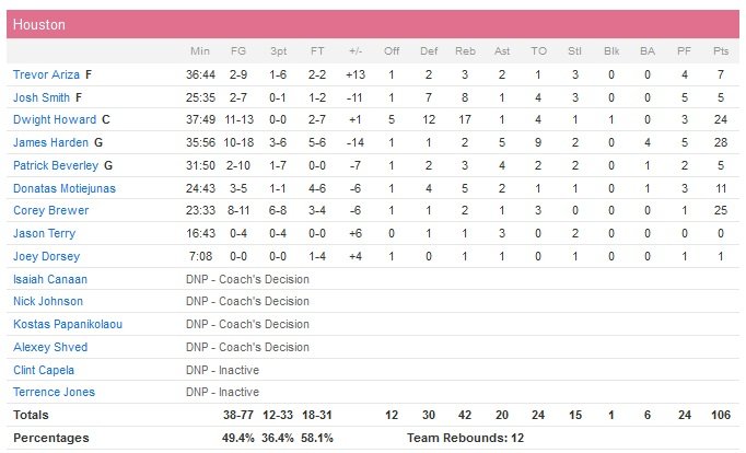 Sans Tony Parker (ischio-jambiers) et Kawhi Leonard (déchirure ligament de la main), les Spurs se sont reposés sur Tim Duncan (16 points à 6/12, 8 rebonds, 3 passes, 3 interceptions et 2 contres) en début et fin de match. Manu Ginobili apporte lui 15 points (5/7, 5 rebonds, 4 passes). En face James Harden termine à 28 points (10/18, 5 passes, 9 ballons perdus) et Dwight Howard à 24 points (11/13) et 17 rebonds alors que Corey Brewer (25 points à 8/11) connaît plus de succès que Josh Smith (5 points à 2/7, 8 rebonds, 2 interceptions) pour les nouvelles recrues. La bataille fût longue et épuisante pour les deux équipes, qui verront l’avantage changer 20 fois de camp et 13 égalisations durant la rencontre. San Antonio (47%) marque 28 points dans chacun de deux premiers quarts-temps et ne mène que d’un point à la pause, 56-55.