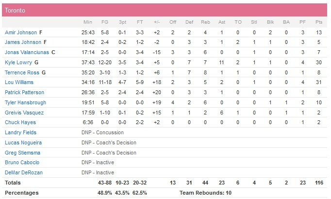 Après une victoire de 12 points sur les Clippers samedi, les Raptors mènent d’un point suite à deux lancers-francs de Williams puis sont devant 100-94 après un 3-points de ce même joueur. Robinson rate ensuite un 3-points qui permet à Lowry d’aller provoquer deux fautes de l’autre côté et d’accroître l’avance de Toronto à 7 points. L’écart continue de grandir sur un 2+1 de Lowry à 3″59, 109-98. Denver ne se rapprochera pas à moins de 9 points durant les dernières minutes.