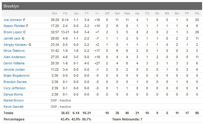 Brook Lopez a battu son record de points cette saison avec 29 unités (13/21, 5 rebonds) et Joe Johnson y a jouté 20 points (8/14, 4 passes) et 11 rebonds dans la victoire des Nets sur les Bulls, qui restaient sur une série de 7 victoires, 96-82. Pour son 5e match depuis son retour, Lopez a démarré dans le 5 à la place de Kevin Garnett. Chicago était méconnaissable avec seulement 8 points de Jimmy Butler (26.4 points de moyenne durant la série de victoires) et 4 de Derrick Rose (2/15).