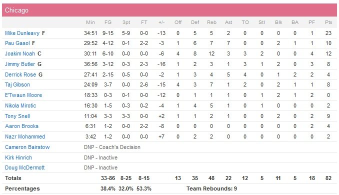 Après un premier quart-temps à 12/20 et 31 points, les Bulls ne marquent ainsi que 14 points à 6/27 (22.2%) dans le deuxième quart. Ils inscrivent néanmoins les 5 premiers points du troisième quart-temps mais le momentum ne dure pas longtemps. Bientôt Brooklyn retrouve ses 10 longueurs d’avance et prend l’avantage 84-69 avant de démarrer le quatrième quart. Sans Brooks, Rose ne peut que constater que ce n’est pas sa soirée (1/9 à la pause et 2/15 après trois quarts-temps), Tom Thibodeau décide de ne même pas faire jouer son meneur pour les 12 dernières minutes (Kirk Hinrich est lui blessé aux ischio et a manqué son 5e match consécutif).