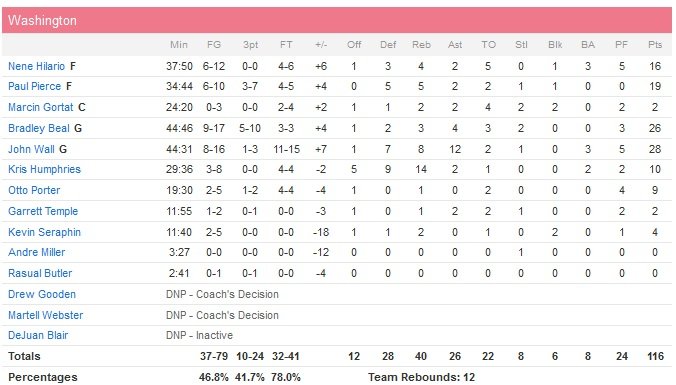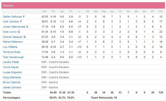 Washington comptera jusqu’à 21 points de retard dans le troisième quart-temps. À 96-78 en début de quart-temps, les Wizards sont finalement portés par les 10 points de Wall, qui permettent d’égaliser à 25.9 secondes du buzzer sur un 3-points de Paul Pierce à 109 partout (19 points). Après deux lancers-francs du vétéran qui donneront le premier avantage du match aux Wizards à 111-110 et un peu plus d’une minute jouée en prolongation, Toronto passe un 6-0 (4 points de Lowry). Wall réduit l’écart à trois-points mais Lowry drive et obtient la faute à 1″25. Menés 119-116 à 10.5 secondes, les Wizards trouvent Beal pour le dunk et les lancers-francs suffiront aux Raptors pour conclure.
