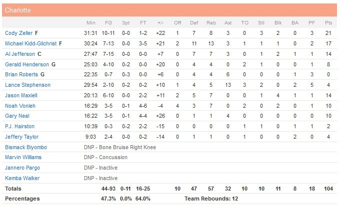 Le pivot de 2,13m et 22 ans (4e choix de la draft 2013 à sa sortie d’Indiana) a combiné aux 14 points d’Al Jefferson et Jason Maxiell pour une équipe de Charlotte largement dominatrice au rebond (57 prises à 44). Les Hornets ont fait parler leur défense en tenant leurs adversaires à moins de 100 points dans 12 de leurs 13 dernières rencontres. En l’absence de Kemba Walker (opéré d’une déchirure du ménisque du genou gauche mercredi et absent au moins 6 semaines), leur jeu est resté solide. Charlotte conclut son premier quart-temps sur un 12-0 (dont deux dunks de Zeller) et à la mi-temps, l’écart est colossal : 32 points (30-15 dans le premier quart et 32-15 dans le deuxième face à des Nuggets qui perdent leur 9e match en 10 rencontres et un 4e match de rang et après n’avoir marqué que 69 points à Memphis la veille).