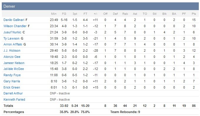 Pour leur défense, les Nuggets ont dû faire sans Kenneth Faried et Darrell Arthur, tous deux malade (Danilo Gallinari termine meilleur marqueur des locaux avec 15 points). Mais cela n’explique pas tous les problèmes de l’équipe de Brian Shaw, qui shoote à 35.9% sur le match contre 47.3% pour ses adversaires et qui encaisse notamment un 14-0 dans le deuxième quart avant de prendre un 10-4 avant la mi-temps.
