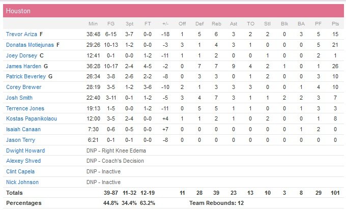 Greg Monroe termine à 19 points à 7/12 et 12 rebonds, Andre Drummond ajoute 11 points à 5/11 3 contres et 16 rebonds et c’était de trop pour Donatas Motiejunas (21 points à 10/13, 4 rebonds, 3 passes) et Josh Smith (7 points à 3/11, 7 rebonds, 3 passes et 2 contres), pas en forme pour son premier match au Palace of Auburn Hills (où le public l’a bien sifflé) en tant que Rocket. Houston encaisse ici une première défaite en 5 matchs alors que les Pistons évitent une 5e défaite de rang. Detroit mène 59-46 à la pause puis 86-69 en début de quatrième quart-temps.