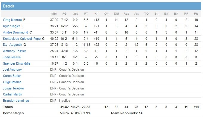 Déjà bien occupé à défendre sur James Harden, Kentavious Caldwell-Pope a tout de même trouvé le moyen de marquer 28 points (dont 12 dans le dernier quart-temps) à 10/21 et 6/11 à 3-points (5 rebonds, 4 passes, 3 contres) pour aider les Pistons à venir à bout des Rockets, 114-101. D.J. Augustin n’est pas en reste avec lui aussi 28 points (8/13, 12 passes) alors que le secteur intérieur fait le boulot en l’absence de Dwight Howard.