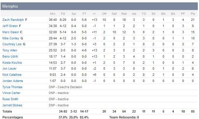 Incertain avant le match après avoir raté deux rencontres en raison d’une entorse du gros orteil, Kevin Durant termine finalement meilleur marqueur d’Oklahoma City avec 15 petits points (5/16, 7 rebonds 4 passes). Russell Westbrook n’est pas loin avec 14 points à 5/16, 6 rebonds et 5 passes et Serge Ibaka signe 13 points et 10 rebonds. Aucune des deux équipes n’a particulièrement bien shooté (Jeff Green et Conley combinent pour un 4/12 et Dion Waiters lâche un 3/14) mais le 35% de réussite du perdant fait forcément tache. Ajoutez à cela les 18 ballons perdus (dont 11 en première mi-temps) des joueurs de Scott Brooks et vous obtenez une vilaine défaite malgré 10 changements d’avantage et 6 égalités en première mi-temps avant que Memphis ne prenne le contrôle des opérations. Les Grizzlies sont menés par les 10 points de Conley à la mi-temps, 45-20.