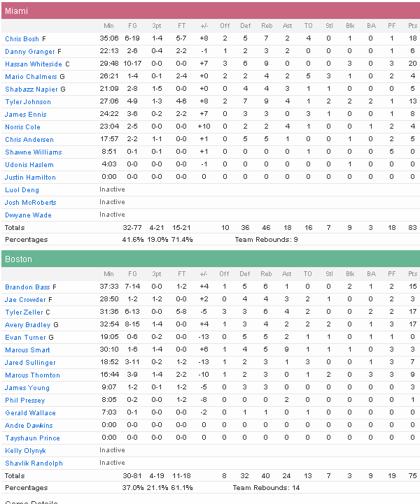 Dans un match où les deux équipes n’ont pas brillé par leur adresse, le Heat a pris les commandes en début de rencontre et a gardé la tête pendant quasiment tout le match dans le sillage de leurs intérieurs Hassan Whiteside (20 points à 10/17 et 9 rebonds en 30 minutes) et Chris Bosh (18 points mais à 6/19 et 7 rebonds). Signé pour 10 jours l’arrière Tyler Johnson a livré un très bon matcha avec 13 points dont des paniers importants en fin de rencontre. Boston a shooté à seulement 37% aux tirs et malgré un beau retour en troisième quart, leur maladresse leur a finalement coûté le match. Seuls trois joueurs atteignent les 10 points et sont sortis du lot: Tyler Zeller et Avery Bradley avec 17 points chacun et Brandon Bass 15 points. Les trois ont combiné 21/42 alors que le reste de l’équipe a shooté à 9/38 dont 8/31 pour le banc.