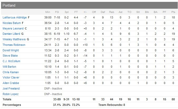 Portland perd de son côté son 8e match en 10 rencontres. Damian Lillard (6/19) et Wesley Matthews (7/15) signent chacun 19 points alors que LaMarcus Aldridge est moins efficace qu’hier dans la défaite face à Atlanta (37 points) avec 18 points et 13 rebonds. Nicolas Batum termine lui à 5 points à 2/8, 7 rebonds et 4 passes dans une équipe qui aura shooté à 37.1% sur l’ensemble de la soirée. Les Bucks prendront jusqu’à 15 points d’avance en première mi-temps avant de se refroidir pour ne mener que de trois points à la pause, 45-42.