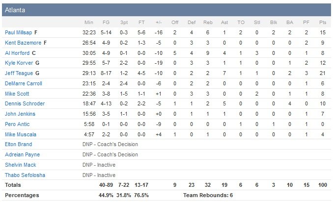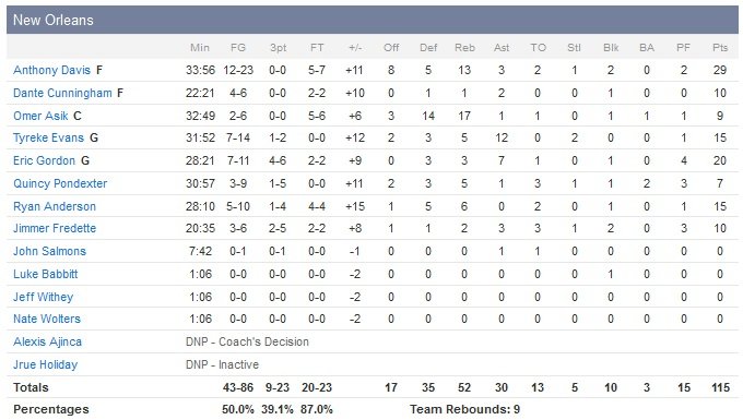 Jeff Teague termine meilleur marqueur des Hawks avec 21 points (8/17, 7 passes) mais son équipe a rapidement pris l’eau dans le premier quart-temps et n’est pas parvenue à se rapprocher suffisamment durant la rencontre. Largement dominés au rebond (52-32 dont 17 pour le seul Omer Asik), les Hawks (17/15 en première mi-temps) laissent également leurs adversaires shooter à 50% sur le match et ne rentrent que 7 de leurs 22 tentatives à 3-points. Eric Gordon marque ainsi 20 points et Tyreke Evans excelle toujours dans son rôle de meneur en remplacement de Jrue Holiday avec 15 points et 12 passes cette nuit. Davis marque 19 points en première mi-temps et permet à son équipe de mener 55-42 à la pause, bien épaulé par Eric Gordon et ses 13 points. L’arrière sera ensuite bien secondé par Jimmer Fredette en raison de ses problèmes de fautes.