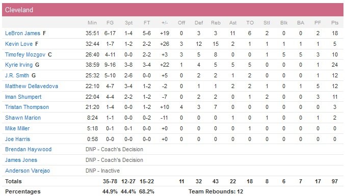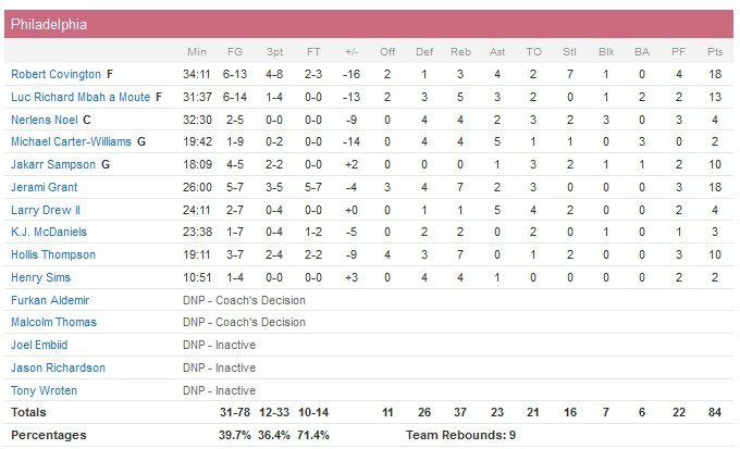 Les Sixers auront tout fait pour rester dans le match cette nuit mais n’avaient pas les ressources nécessaires pour résister au duo Kyrie Irving (24 points à 9/16, 5 rebonds, 5 passes) et LeBron James (18 points à 11/17 et 11 passes) lorsqu’il le fallait. Cleveland obtient donc sa 11e victoire de rang (plus longue série depuis 2010, durant laquelle les Cavs avaient gagné 13 matchs de rang), 97-84 et compte désormais 30 victoires pour 20 défaites en milieu de tableau à l’Est. Kevin love ajoute un match solide au rebond à défaut de rentrer ses shoots (5 points à 1/7 et 15 rebonds) et Matthew Dellavedova rentre quelques trois-points clutchs dans le quatrième quart-temps pour aider son équipe à garantir cette nouvelle victoire.
