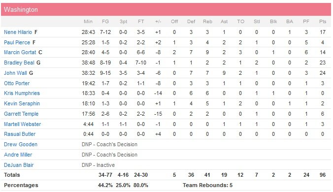 Atlanta va ainsi manquer 8 de ses 9 shoots et 4 de ses 6 lancers-francs tout en perdant deux ballons durant une série noire pendant le troisième quart. Washington en profite pour prendre l’avantage 74-73 sur deux lancers de Wall à 1″17 de la fin de la période. Les Hawks gardent la tête froide et rentrent les deux derniers paniers du quart-temps pour repasser en tête de trois points, 77-74, avant de jouer le quatrième. Teague achève les Wizards sur un drive et marque un layup malgré une poussette de Marcin Gortat (14 points à 4/5 et 9 rebonds) qui lui vaut une faute et donc deux lancers-francs. Le meneur ne tremble pas sur la ligne et porte le score à 103-92 alors qu’il reste 1″54 à jouer.