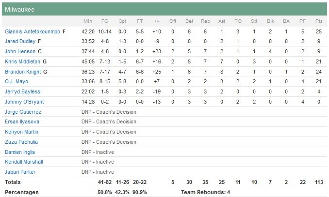 Menés 66-57, les Bucks terminent leur troisième quart-temps sur un violent 17-2 porté par les 10 points d’Antetokounmpo. Boozer maintient son équipe à 6 points sur un layup à 1″02 mais Mayo rentre un premier 3-points qui réduit l’écart à 91-88. Jeremy Lin répond par un tir primé lui aussi sur la possession suivante mais Knight a le dernier mot avec un nouveau shoot longue distance qui porte le score à 94-91 à 20.4 secondes du buzzer. Après une violation des 24 secondes, Milwaukee récupère le ballon à 7 secondes de la fin et après un temps-mort, Mayo plante son 3-points assassin qui va ensuite permettre à Knight de mener son équipe à la victoire en prolongation, en démarrant par un 3-points qui donnera un avantage définitif à son équipe.