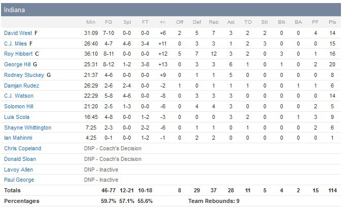 Les Pistons avaient gagné les deux précédentes confrontations entre les deux équipes cette saison et les 18 points et 16 rebonds d’Andre Drummmond et 16 points et 9 rebonds de Greg Monroe n’ont pas suffi. D.J. Augustin et Kyle Singler (7/23 à eux deux) n’étaient pas dedans aux shoots alors que l’arme offensive Kentavious Caldwell-Pope s’est blessé au tendon d’Achille après trois minutes de jeu… L’impact d’Hill dans le jeu des Pacers est immédiat : il distribue une passe puis marque un 3-points sur les premières séquences du match pour aider Indiana à mener 5-0. Monroe marquera juste avant la mi-temps pour donner un point d’avance aux Pistons à la pause, 49-48.