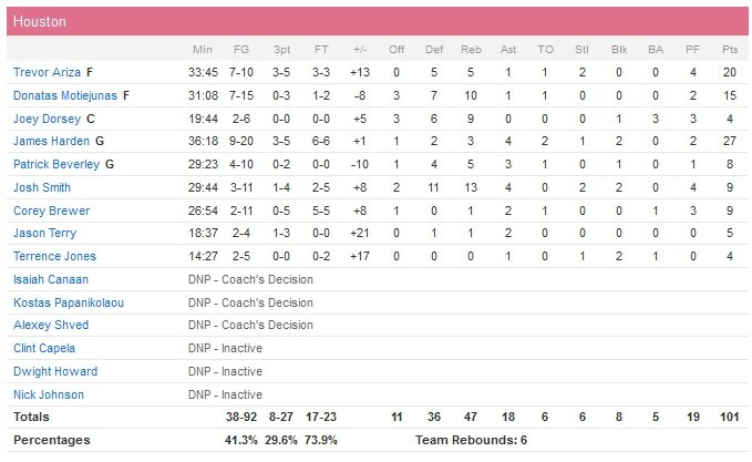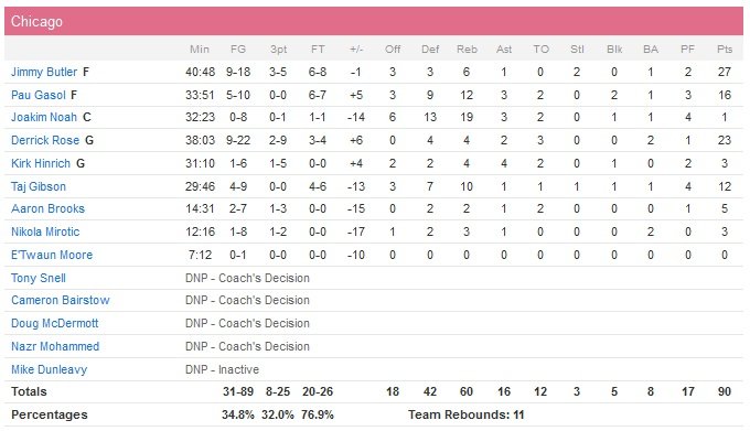Derrick Rose, qui a joué son 12e match d’affilée pour la première fois depuis la saison 2010-11, termine à 23 points à 9/22 4 rebonds et 4 passes tandis que Jimmy Butler est le meilleur marqueur de l’équipe avec 27 points à 9/18. Comme dit plus haut, les big men de Chicago font le boulot au rebond et Joakim Noah prend à lui tout seul 19 rebonds mais son impact offensif est nul avec un 0/8 aux tirs. Pau Gasol signe lui un honnête double-double avec 16 points à 5/10 et 12 rebonds alors que Taj Gibson ajoute 12 points et 10 rebonds. Dans toutes les autres catégories statistiques, ce sont bien les Rockets qui ont l’avantage (50 points à 28 dans la peinture, 8 contres à 5 et un 41.3% aux tirs contre seulement 34.8 pour Chicago).