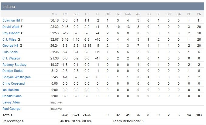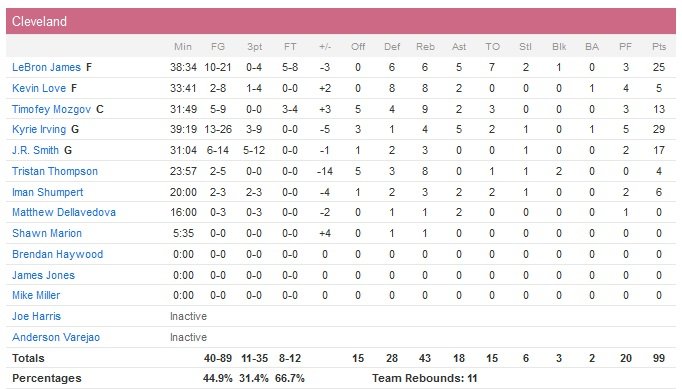 Cleveland mènera de jusqu’à 13 points dans ce match sans pour autant parvenir à éloigné suffisamment ses adversaires du jour durant la rencontre. Indiana se rapproche dans les 4 dernières minutes du troisième quart-temps suite à un 14-2 qui les ramène à trois points avant d’entamer le quatrième. David West signe 20 points et 13 rebonds face à une raquette moyenne (5 points à 2/8 et 8 rebonds pour Kevin Love et 13 points à 5/9 et 9 rebonds pour Timofey Mozgov) et surtout éclipsée par le duo gourmand Kyrie Irving (29 points à 13/26, 5 passes 4 rebonds) / LeBron James (25 points à 10/21, 6 rebonds 5 passes mais aussi 7 ballons perdus).