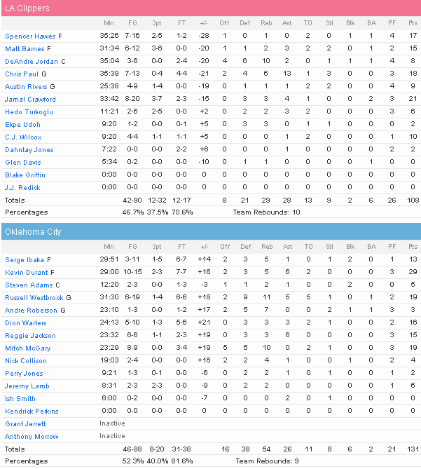 Avec un bon duo Kevin Durant (29 points à 10/15 et 6 passes) – Russell Westbrook (19 points à 6/19, 11 rebonds et 5 passes) et un banc ultra performant emmené par Mitch McGary (19 points à 8/9 et 10 rebonds), Reggie Jackson (15 points à 6/6 et 6 passes) et Dion Waiters (16 points à 5/10), le Thunder s’est facilité la tâche et ont vite fait la différence. Ils ont également dominé au rebond (54 à 29) tout en ne perdant que 11 ballons et en shootant. Dépassés défensivement (52.9% aux tirs pour le Thunder et 16 rebonds offensifs) et dominés au rebond, les Clippers n’ont rien pu faire malgré 18 points et 13 passes de Chris Paul, 21 (la plupart dans le garbage time) de Jamal Crawford, 17 points de Spencer Hawes et 15 de Matt Barnes. Sans Blake Griffin, ça a été compliqué offensivement pour LA, lui qui est le second point d’ancrage de l’attaque avec Chris Paul. Pour ne rien arranger, ils ont perdu Glen Davis en début de match