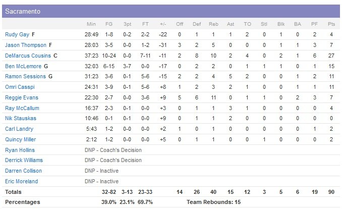 DeMarcus Cousins signe lui un double-double avec 27 points et 10 rebonds avant de sortir lui aussi pour 6 fautes dans le quatrième quart-temps. Ben McLemore ajoute 15 points alors que c’était une soirée à oublier pour Rudy Gay, auteur de 4 points à 1/8 en 28 minutes de jeu. Les Kings n’ont pas eu le temps d’espérer revenir au score en deuxième mi-temps. Utah leur inflige un 15-2 et prend 23 points d’avance, un déficit beaucoup trop lourd pour une équipe de Sacramento en pleine crise (17V-32D, troisième défaite consécutive) et qui jouait sans Darren Collison (abdominaux).