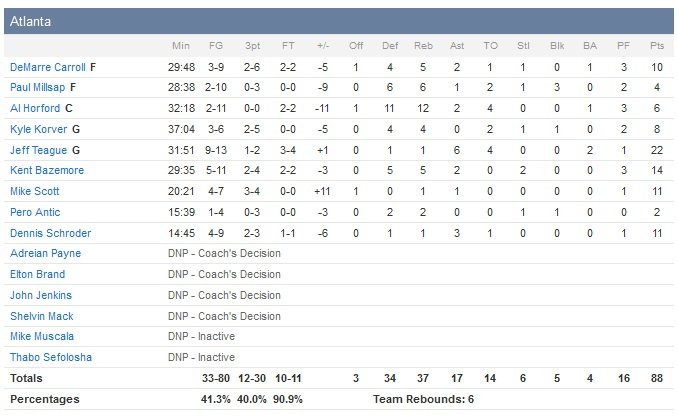 Mike Conley signe 21 points et 6 passes alors que Marc Gasol enregistre un double-double avec 16 points et 10 rebonds. Deux soirs après avoir battu les Warriors (dans un match beaucoup moins lent et physique), les Hawks tenaient bon à égalité 86 partout suite à un 3-points de Mike Scott à 3″24 lorsque leurs adversaires ont enchaîné en marquant les 8 points suivants. Atlanta a mis du temps à s’adapter à ce rythme freiné qui a finalement bénéficié aux locaux. Zach Randolph signe 11 points et 15 rebonds, Kosta Koufos ajoute 10 points et 7 rebonds et Memphis domine 55-37 au rebond (un rebond offensif de Tony Allen donnera d’ailleurs une avance de deux points 88-86 aux Grizzlies à 2″28 du buzzer).
