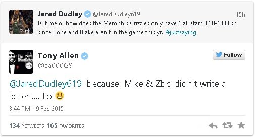 Jared Dudley: C’est moi ou les Memphis Grizzlies ont seulement un All-Star ?!!! 38-18!! Surtout avec les absences de Kobe Bryant et Blake Griffin. #Je dis ça, je dis rien