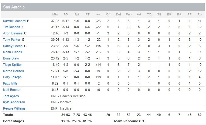 Les visiteurs manquent 12 de leurs 15 premières tentatives dans le premier quart-temps même si un buzzer de Manu Ginobili à 3-points permet aux Spurs de ne prendre que trois points de retard après 12 minutes, 28-25. Toronto est ensuite obligé à prendre deux temps-morts en 6 minutes pour débuter le deuxième quart après avoir encaissé un 15-5 de la part des Spurs, repassés devant 40-33. Les locaux marquent finalement les 8 derniers points de la mi-temps et reprennent la tête, 46-45, à la pause. James Johnson démarre la deuxième mi-temps par un dunk mais San Antonio répond par un 9-0, qui sera tout de suite enchaîné par un 10-0 en faveur des Raptors. Les Spurs (7/29 pour les titulaires en première mi-temps) ne marquent ensuite plus pendant presque 6 minutes avant que Boris Diaw ne viennent libérer les siens sur la ligne des lancers-francs. Bien aidés par les 6 points et 8 rebonds de Valanciunas dans le troisième quart, Toronto fait toujours la course en tête 64-58 à la fin du troisième quart-temps.