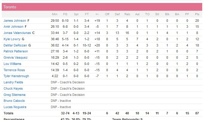 Parker égalise à 75 partout à 5″02 du buzzer et Duncan ajoute deux lancers-francs à 3″40 qui redonnent espoir à San Antonio. Lowry répond par un fadeaway mais Belinelli plante à 3-points à 2″20 pour restaurer l’avantage des Spurs. Les deux équipes se répondent coup pour coup et Toronto est devant 84-82 après un 3-points d’Amir Johnson qui fait suite à une violation des 24 secondes des visiteurs. Ginobili et Belinelli manquent ensuite leurs shoots à 3-points puis Johnson rentre un lancer sur deux à 4 secondes du buzzer. Menés 85-82, Tim Duncan a envoyé la remise en jeu en tribune et DeMar DeRozan (18 point) plie le match.
