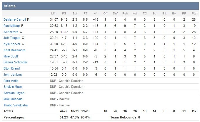 Un record de points en saison pour Al Horford (28 points à 11/18 et 8 rebonds) et un record de points en carrière pour DeMarre Carroll (26 points à 9/13, 4 rebonds, 3 interceptions) cette nuit chez les Hawks, facilement vainqueurs des Wolves, 117-105.
